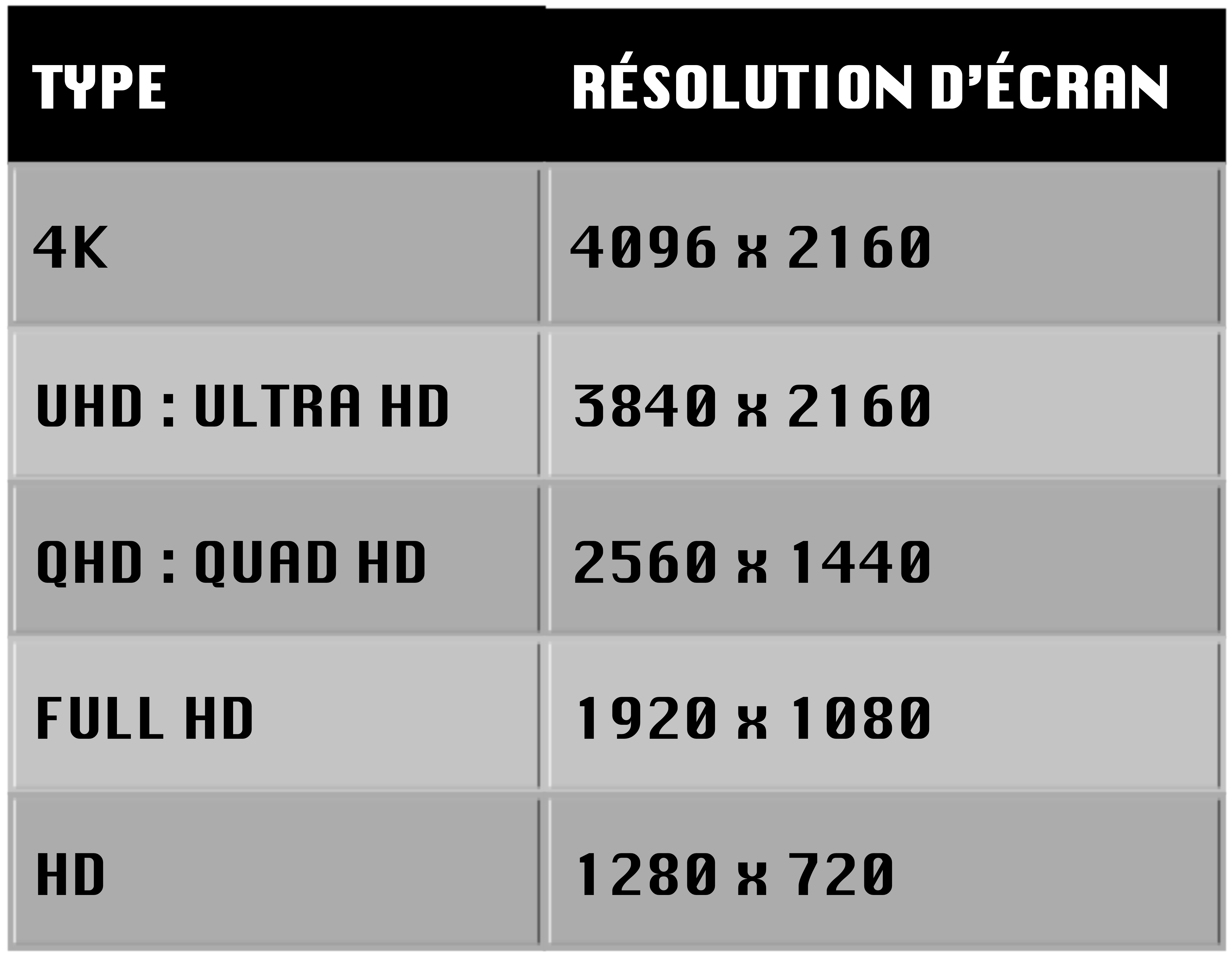 Il y a la HD, le FULL UHD et l’UHD (ULTRA HD) avec la 4K, 8K et même 16K (on en parle dans certains milieux). Voyons tout cela dans ce tableau récapitulatif des résolutions.