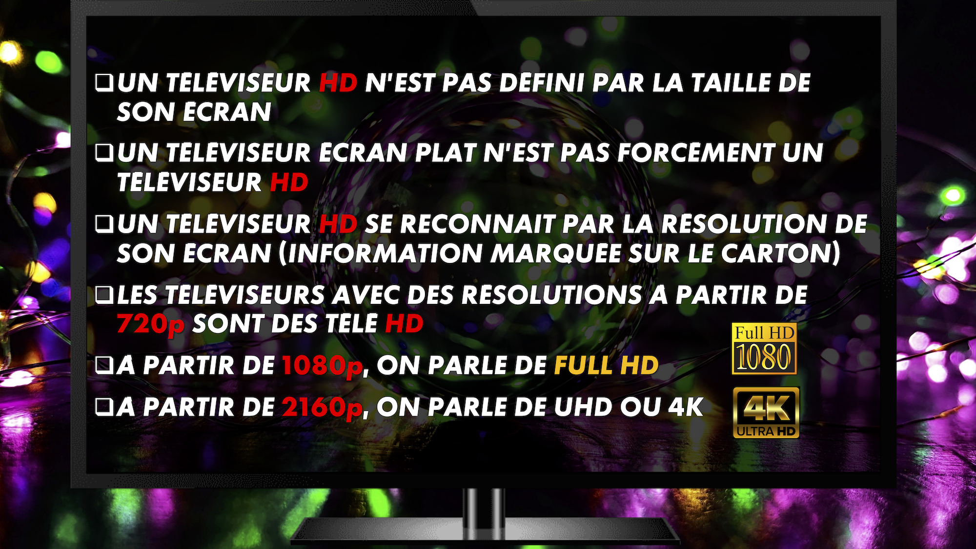 La HD et le FULL HD (1080p de résolution), c’est la qualité que nous voyons et qui est beau à voir pour nos yeux. Les techniciens nous parleront de normes de compression. En la matière, il y a le MPEG4 (Moving Picture Experts Group) qui selon certains analystes est une technologie en fin de cycle de vie. La nouvelle norme de compression est le HEVC (High Efficiency Video Coding) permettant de donner de l’UHD (Ultra HD) avec la 4K et autres. Comme je l’ai précisé plus haut, un téléviseur écran plat n’est pas forcément un téléviseur HD. Il faut une résolution d’au minimum 720p. Et c’est marqué sur le carton de l’appareil. Avant d’acheter un téléviseur, vérifiez toujours les caractéristiques techniques sur le carton ou même Internet pour être sûr que votre acquisition répond aux caractéristiques que vous recherchez.