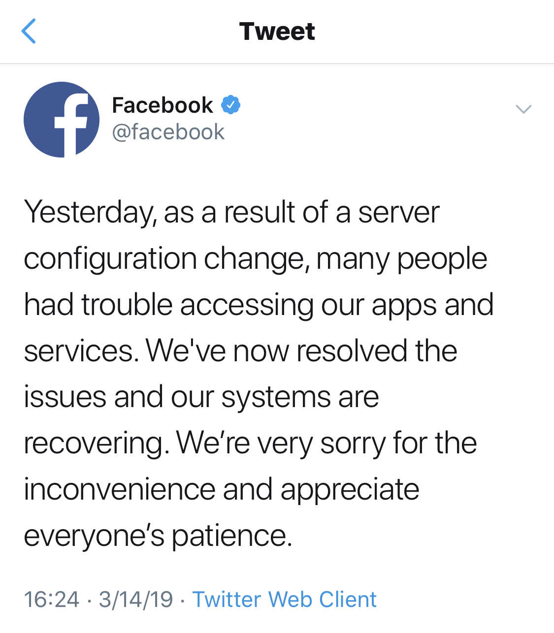 Facebook s’explique et s’excuse sur la panne survenue le 13 mars 2019