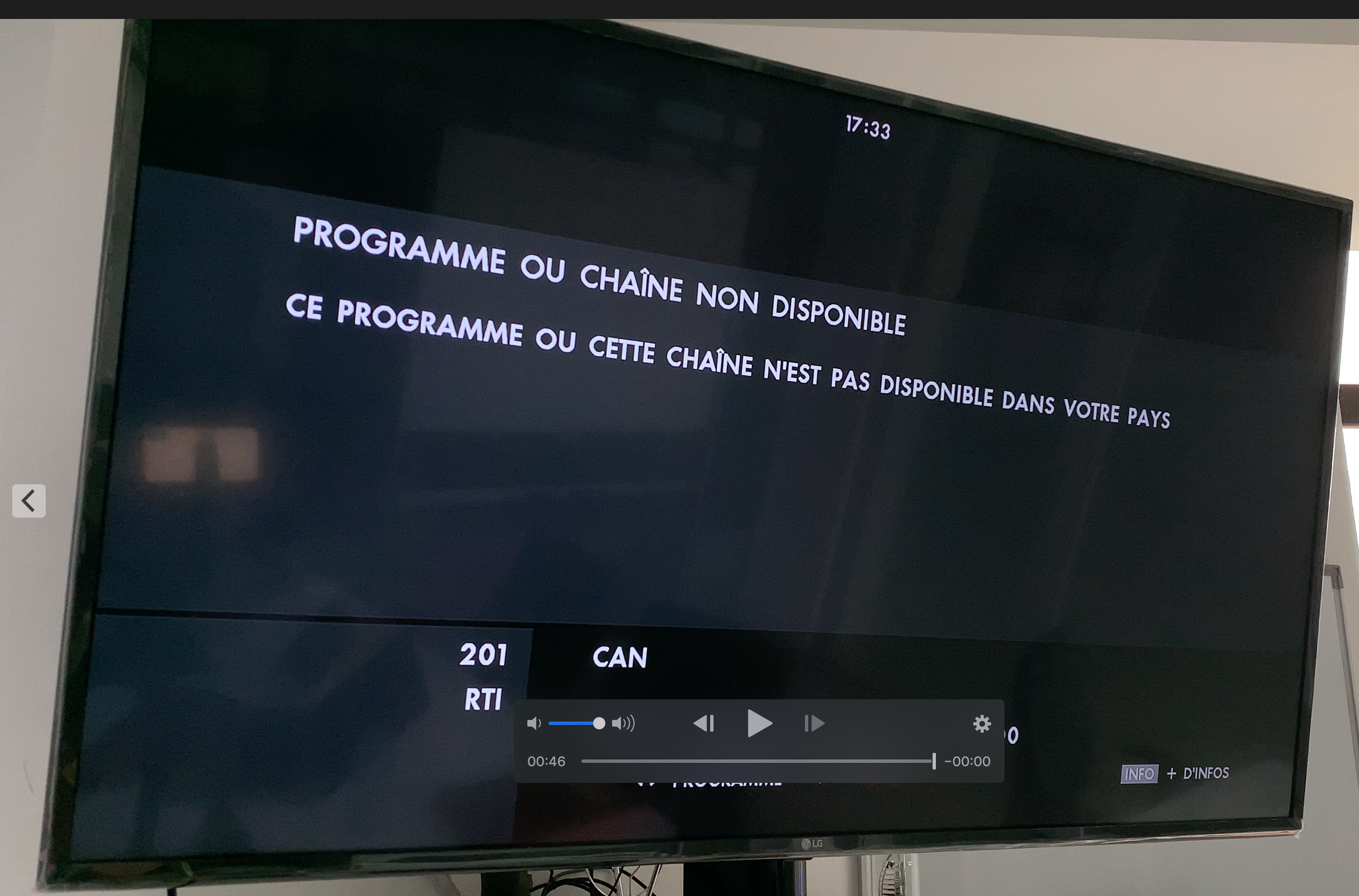 Ici sur cette image, la RTI est occultée au Burkina Faso. On peut donc voir clairement le message s’afficher et indiquer « PROGRAMME OU CHAINE NON DISPONIBLE. CE PROGRAMME OU CETTE CHAINE N’EST PAS DISPONIBLE DANS VOTRE PAYS »