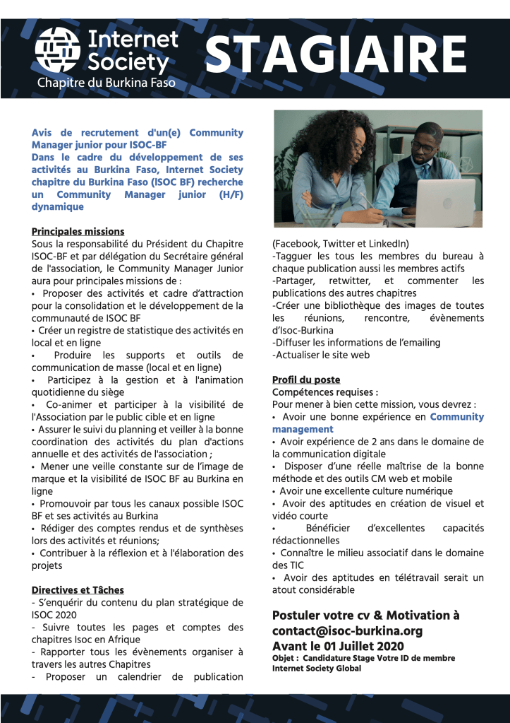 Avis de recrutement d’un(e) Community Manager junior pour ISOC-BF