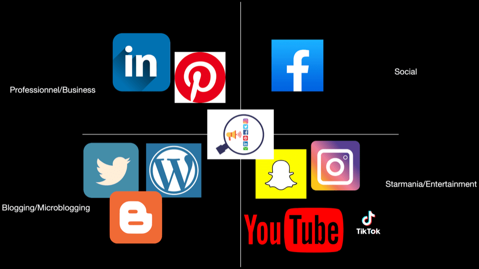 In the following diagram, we show the choice of each platform of social media depending on their orientation (professional/business, social, blogging, entertainment).